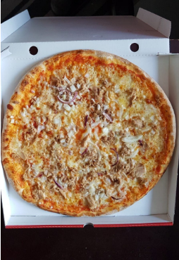Die Pescatora-Pizza wird während des Backens mit Thunfisch in Öl und frischen Zwiebeln gefüllt.