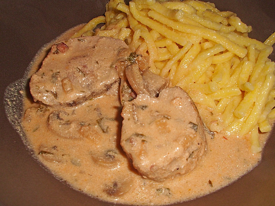 Schweinefilet in Pilz-Sahnesauce. Beilage: Tagliatelle mit Sauce.